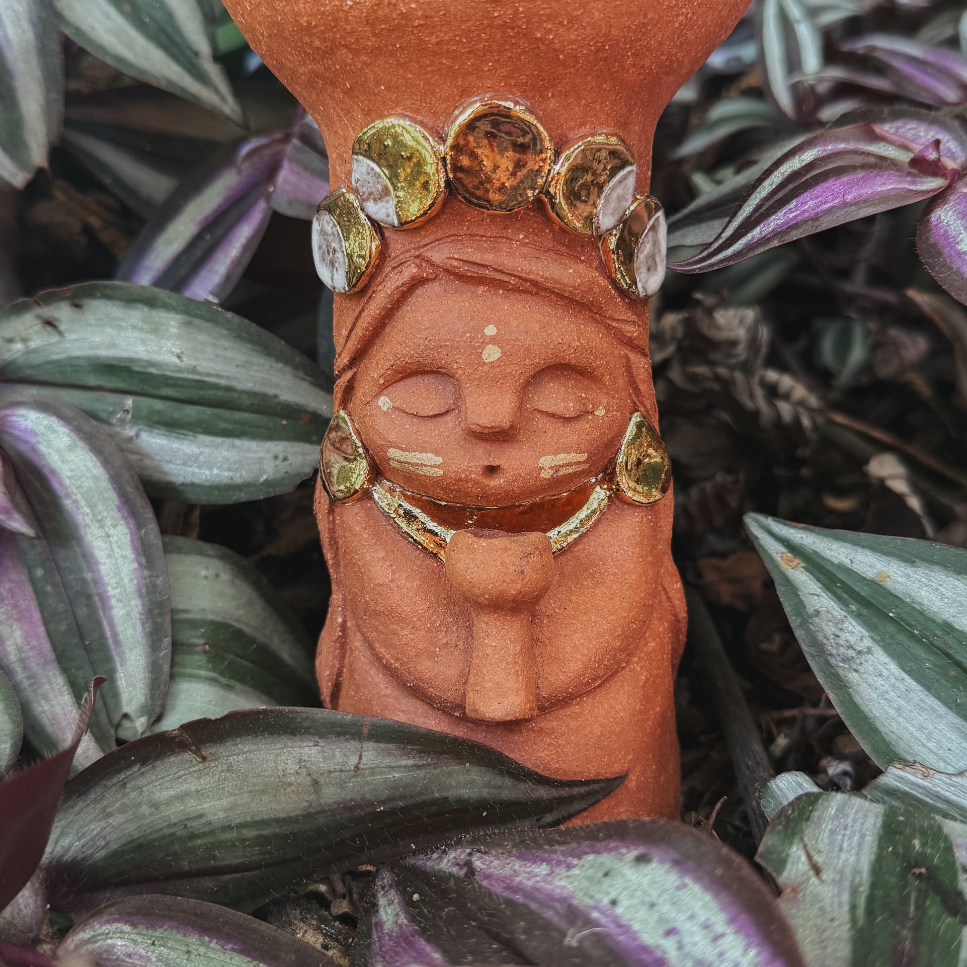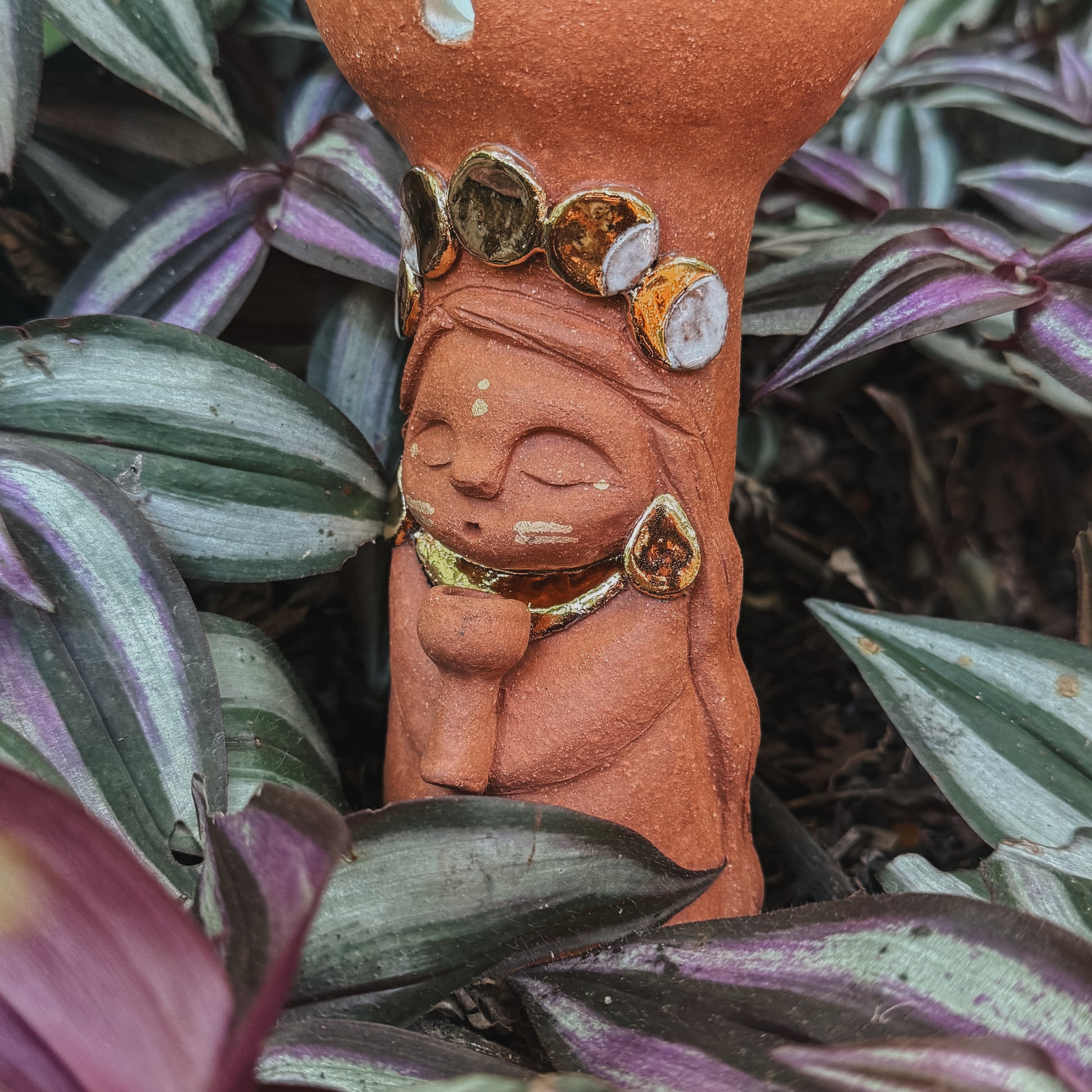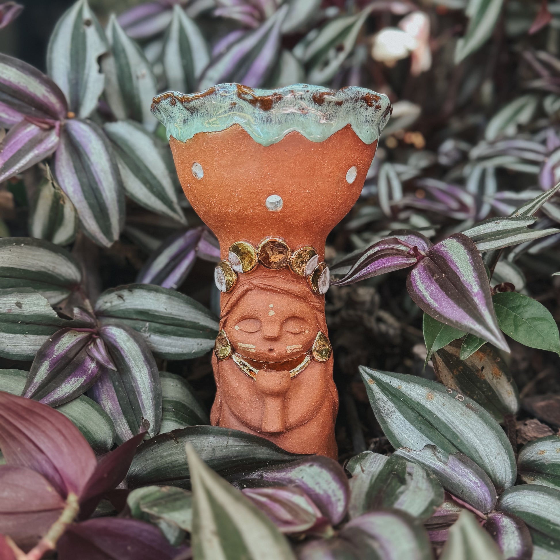 Sahumador Nana (Abuela) Fuego. Nacida del fuego suave y la memoria del barro, esta pieza honra a las guardianas del humo, a las abuelas que caminan entre mundos con rezos encendidos. Representa la medicina de quien limpia, protege y guía desde la ternura y la sabiduría.